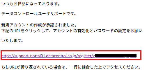 件名 : ユーザーアクティベーションのお願い 【データコントロールユーザサポート】メールが受信されない場合、迷惑メール等に振り分けられていないかご確認ください。